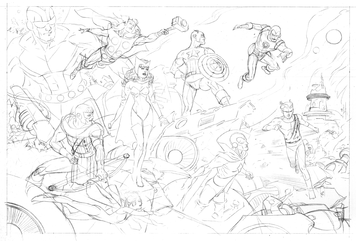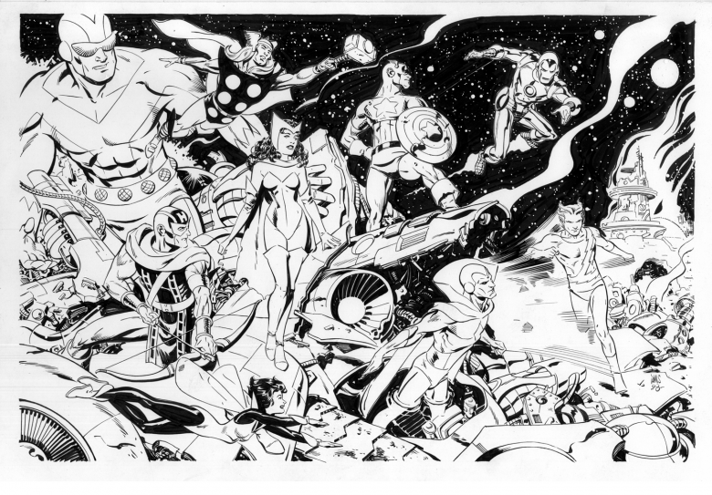Something of a bookend to the JLA denouement piece (the part of the story after the climax but before "the end") Here we see our heroes in what appears to be the end of act one. There's been a setup, now comes the confrontation. It could be the Kree , the Skrulls, the minions of Kang... who knows? Whoever it is is going to discover that getting the old gang together may not have been the brightest idea.
