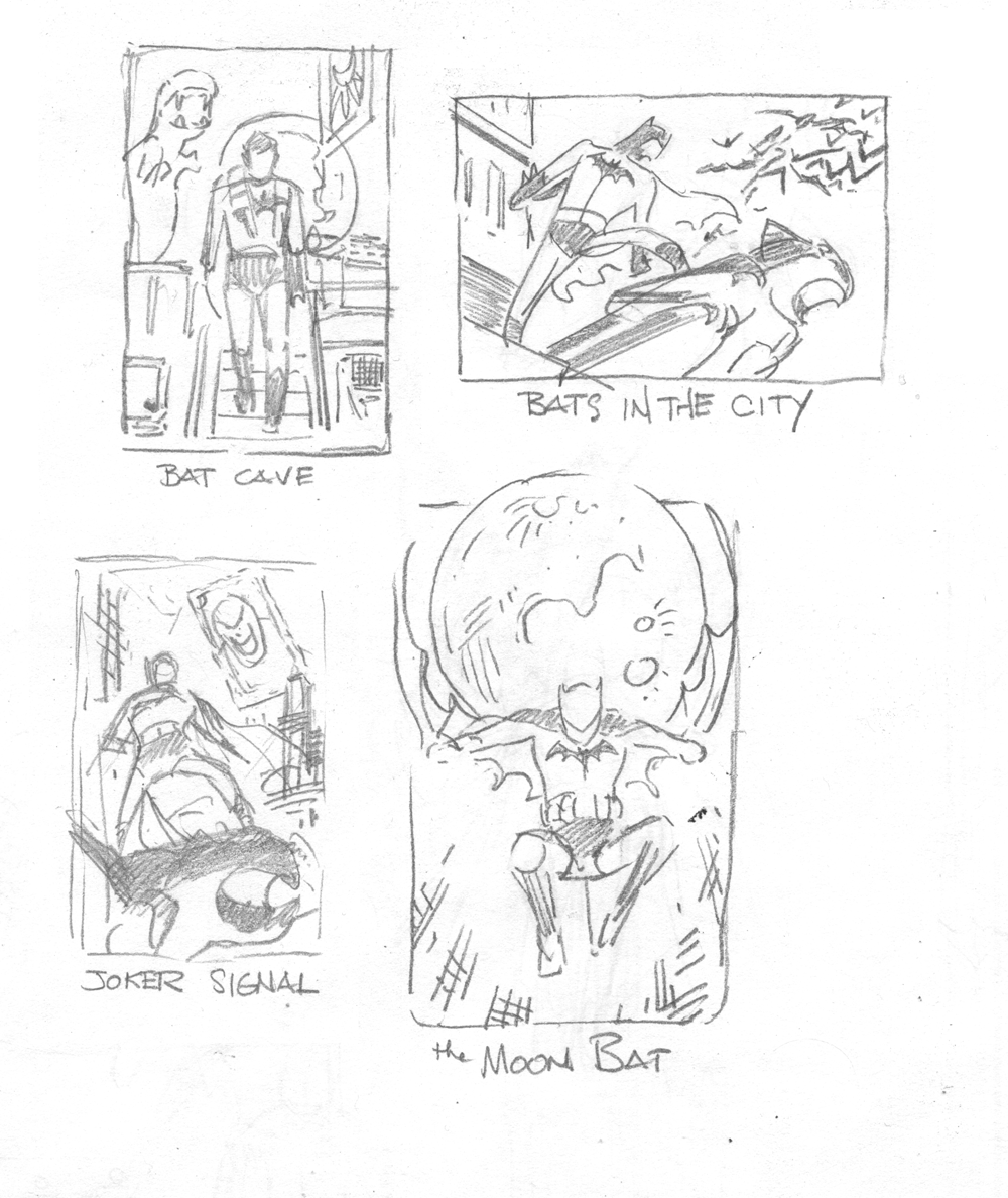 You've caught Uncle Smitty mid task this week, kiddies. A commission request... pretty simple: the Batman. That was it. A few thumbnails later, the client likes the Joker Signal thumb but, not the Joker signal itself. Can we swap it for the Bat Signal?