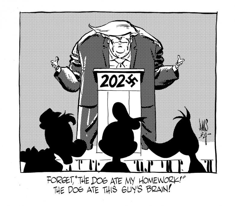 Let's forget he's a depraved, violent, sexual deviant. Let's forget he's a convicted felon. Forget the bigotry, that he thinks we won the Revolutionary war with superior airplanes or that he HATES TAYLOR SWIFT in all caps. This is a guy who's told us he's going to be a dictator, that we need to suspend the constitution, that he doesn't care about us and if we vote for him one more time no one will ever need to vote again (like he'd let us)