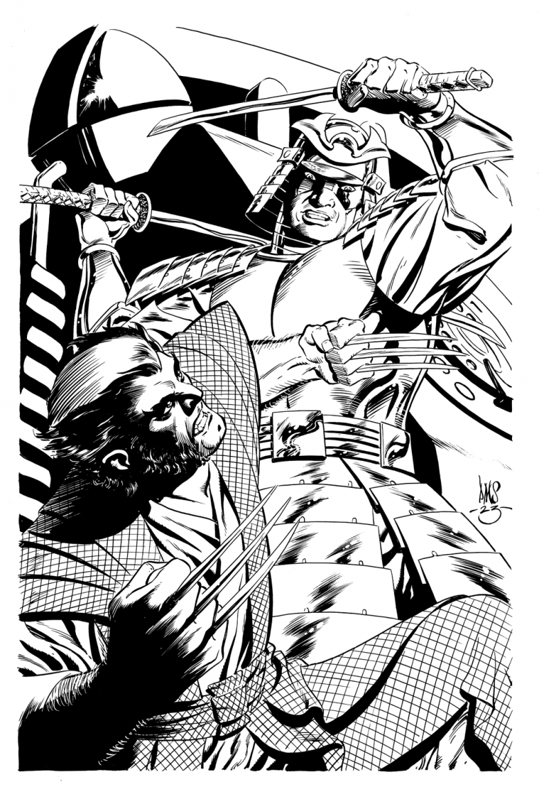 Wolverine and the Silver Samurai together again atop the Phone Bldg in Tokyo. This is for the Hero Initiative auction in Baltimore on Sept 9. Non Baltimorians (Baltimites? Baltimians?) can bid by web at the following link