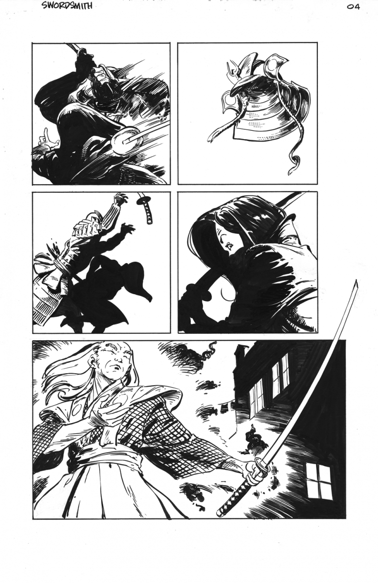 By 2003 I'd been drawing for near 50 years and inking with a brush for more than 30. It was time to get out of my own way and just allow what was inside me to happen rather than try to force things. The figure in the last panel of Pg 4 may be the best bit of inking I've ever done. The simplicity, grace and naturalism of it haunts me to this day. Why can't it always be that easy?