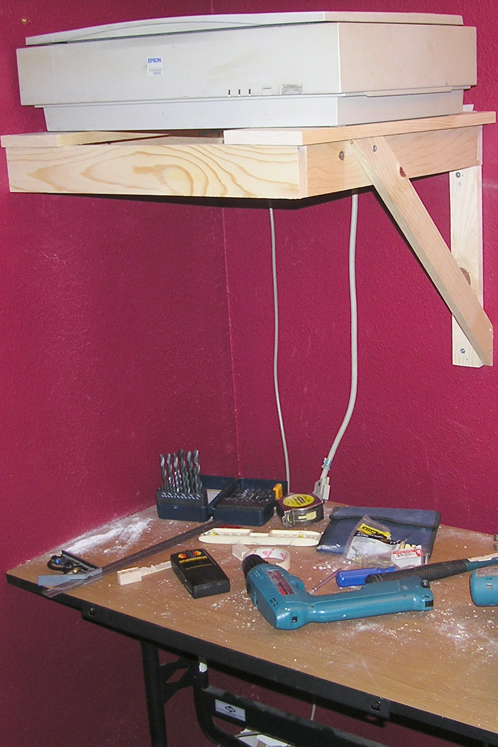 The old computer/scanner/printer/monitor-workstation has to go. The monitor and wi-fi printer go, too. The scanner has to stay. Within 3ft of the tower no less. That means overhead.