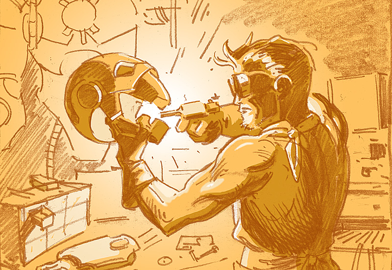 So, feeling sufficiently manly and engine-ery like, I flash back to some thumbnails filed during the "clean up the table" portion of our program. Marvel had asked if I'd like to do an Iron Man cover. I responded with a couple of sketches along the lines of Tony as the constant tinkerer. They said cool but, they needed something as a build-up for the upcoming Guardians of the Galaxy flick… thanks for thinking of me, really. Maybe another project, another time...