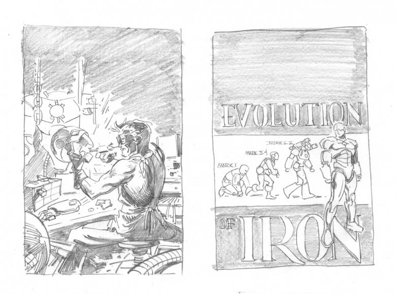So, feeling sufficiently manly and engine-ery like, I flash back to some thumbnails filed during the "clean up the table" portion of our program. Marvel had asked if I'd like to do an Iron Man cover. I responded with a couple of sketches along the lines of Tony as the constant tinkerer.  They said cool but, they needed something as a build-up for the upcoming Guardians of the Galaxy flick… thanks for thinking of me, really. Maybe another project, another time...