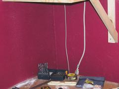 With surprisingly little help from the hardware store (4- 3" wood screws) I slap it together with scrap wood and orphans from the screw jar. I go to cut the top and… @#$%! That's not plywood, that's 3/16" masonite! …tomorrow… for now, I still have enough wood for planks (insert Big Tom Sick cheer…. yeah)